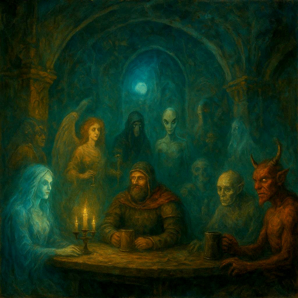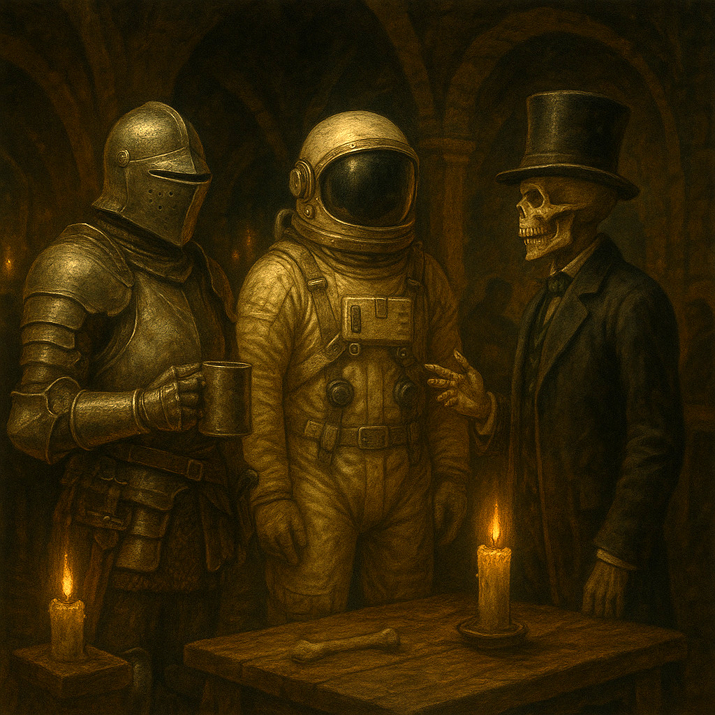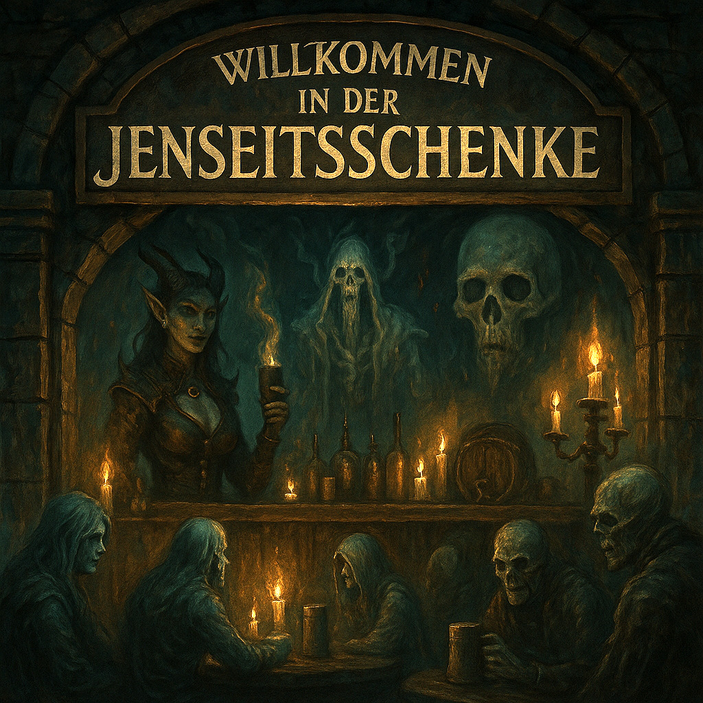 Abseits von Zeit und Raum befindet sich die Jenseitsschenke. Erschaffen von den uralten Numina des Totenreichs, ist sie ein Zufluchtsort für ruhelose Seelen, die zwischen den Welten umherirren. Die göttliche Macht von Horeas, dem Gott der Toten, vereint sich hier mit der finsteren Weisheit der Dämonin Na'Ghara, der Alten des Zerfalls, und dem urzeitlichen Wissen des Totems Ogh, dem Inbegriff des Todes selbst. Ein Ort für die Gefallenen! Hier finden all jene Zuflucht, deren Reise im Diesseits ihr Ende gefunden hat, deren Rhu jedoch noch nicht gänzlich ins Licht oder in die Dunkelheit eingegangen ist. Gefallene Charaktere aus allen Zeitaltern und Epochen treffen sich in der Jenseitsschenke, um Geschichten zu erzählen, Pläne zu schmieden oder einfach nur den bitteren Trank der Ewigkeit zu kosten.