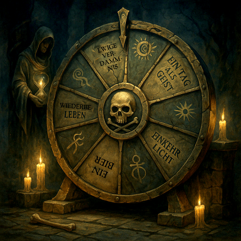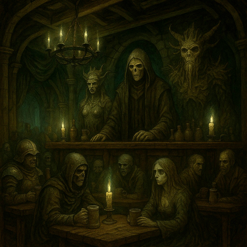 Abseits von Zeit und Raum befindet sich die Jenseitsschenke. Erschaffen von den uralten Numina des Totenreichs, ist sie ein Zufluchtsort für ruhelose Seelen, die zwischen den Welten umherirren. Die göttliche Macht von Horeas, dem Gott der Toten, vereint sich hier mit der finsteren Weisheit der Dämonin Na'Ghara, der Alten des Zerfalls, und dem urzeitlichen Wissen des Totems Ogh, dem Inbegriff des Todes selbst. Ein Ort für die Gefallenen! Hier finden all jene Zuflucht, deren Reise im Diesseits ihr Ende gefunden hat, deren Rhu jedoch noch nicht gänzlich ins Licht oder in die Dunkelheit eingegangen ist. Gefallene Charaktere aus allen Zeitaltern und Epochen treffen sich in der Jenseitsschenke, um Geschichten zu erzählen, Pläne zu schmieden oder einfach nur den bitteren Trank der Ewigkeit zu kosten.